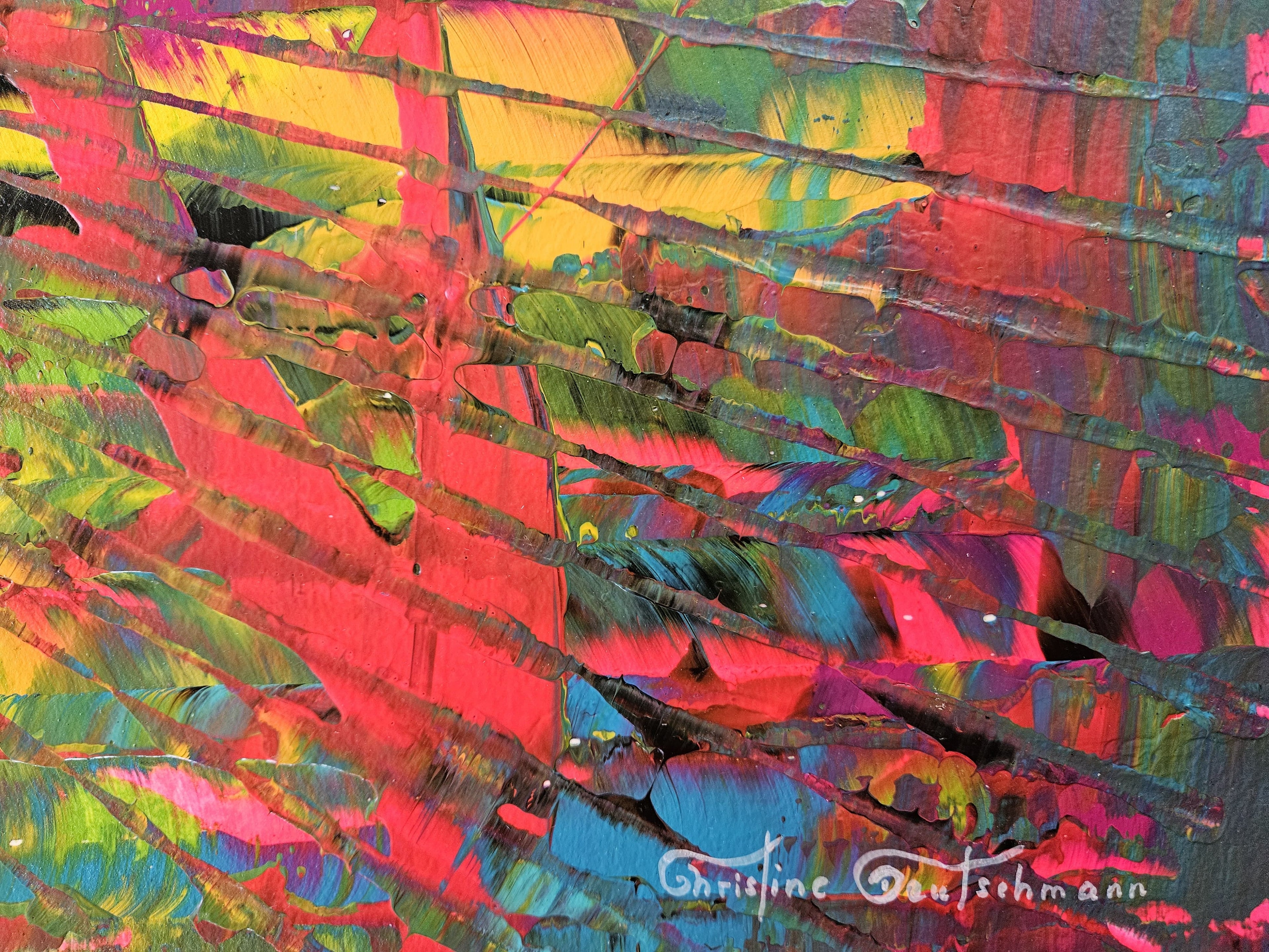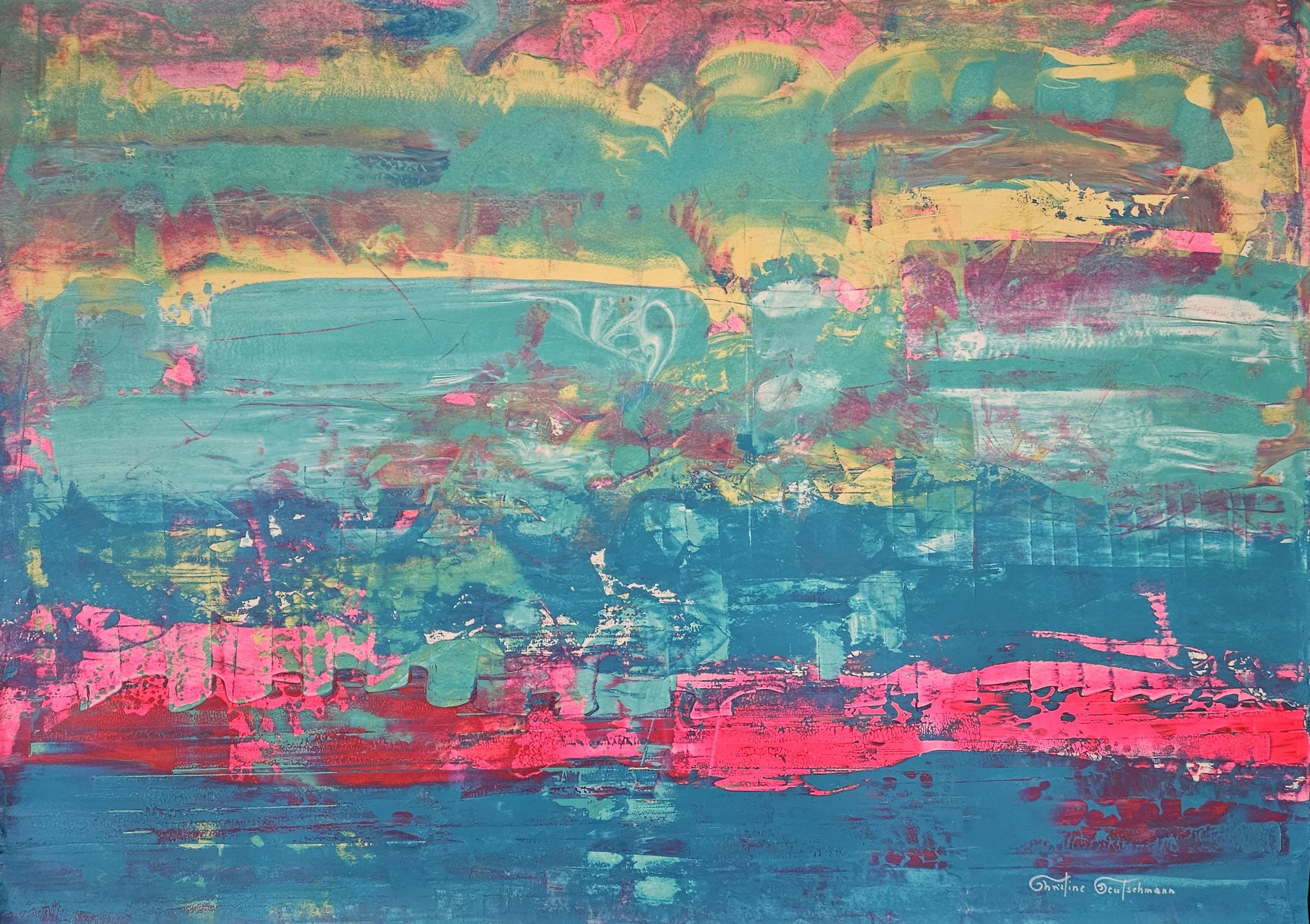 In meiner Technik – inspiriert von der Rakelkunst – treffen Kontrolle und Loslassen aufeinander. Farben werden geschichtet, freigelegt und manchmal auch zerstört. Was darunter zum Vorschein kommt, ist extrem spannend und kraftvoller als jede Oberfläche es sein könnte: Emotionen und ausdrucksstarke Lebendigkeit mit einer Spur des Unsichtbaren.